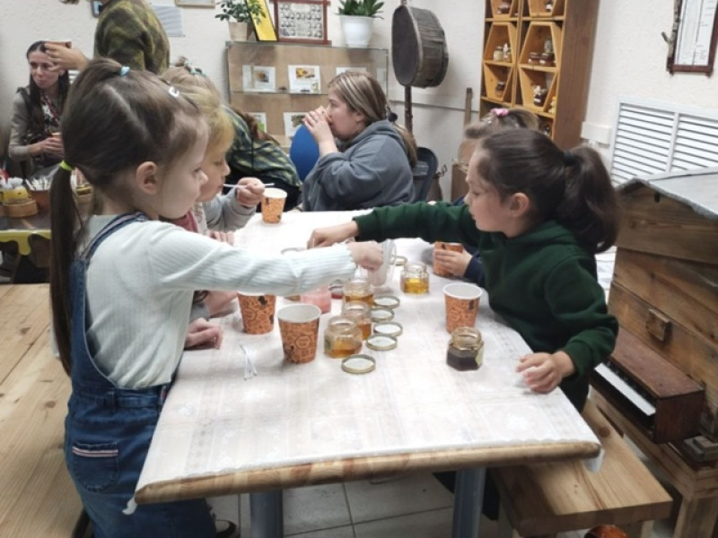 Кульминацией встречи, конечно же, стала сладкая дегустация! Мы приготовили для детей и взрослых несколько сортов ароматного мёда и травяной чай. Каждый смог найти свой понравившийся вкус. А безоговорочным фаворитом и у детей, и у родителей стал нежный крем-мёд с малиной — наш специальный, «детский» сорт.